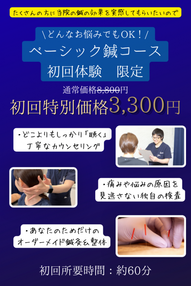 A、初回はカウンセリング込みで約60分、2回目以降は30〜40分程度です。通常コースのほか、仕事の合間などお時間がない方にも受けられる「クイック鍼コース」では、ポイントを絞った施術で約15分ほどでお受けいただけます。
