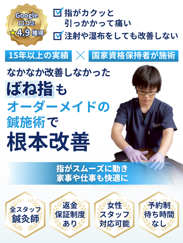 整形外科や一般的な整骨院では、患部の炎症を抑えることにフォーカス することが多いですが、鍼灸師は、体全体のバランスの乱れがバネ指の根本的な原因になっていると考えています。