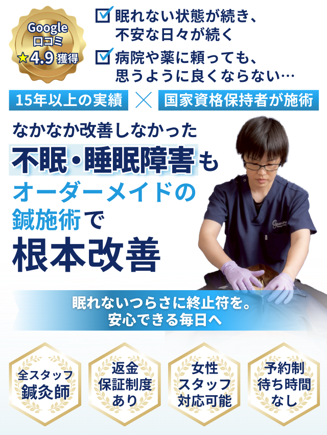 A、はい、可能です。不眠の多くは自律神経の乱れやストレス、筋肉の緊張などが関係しています。鍼灸はこれらに直接アプローチできるため、寝つきが良くなった、夜中の目覚めが減った、朝スッキリ起きられるようになったといったお声を多数いただいています。鍼灸は薬が合わなかった方にも選ばれている自然な療法です。